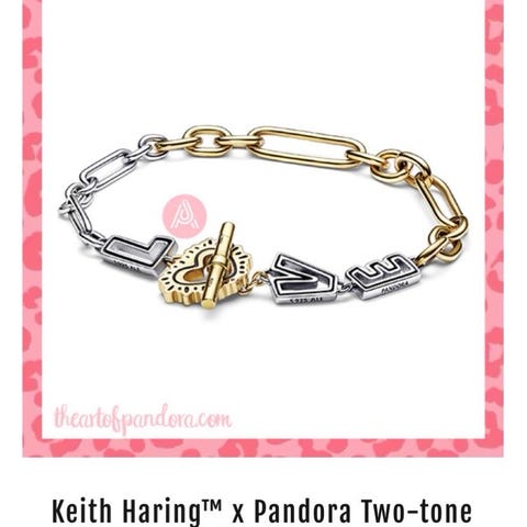 Bring street art with you with the new Keith Haring™ x Pandora Two-Tone Chain Necklace with a T-Lock. Featuring one of Haring's iconic dancing figures at the center, the necklace is crafted from a combination of sterling silver and a unique 14k gold-plated metal blend. The artist's signature lines and style have been recreated using black enamel for the central figure, which also serves as a T-Lock.
