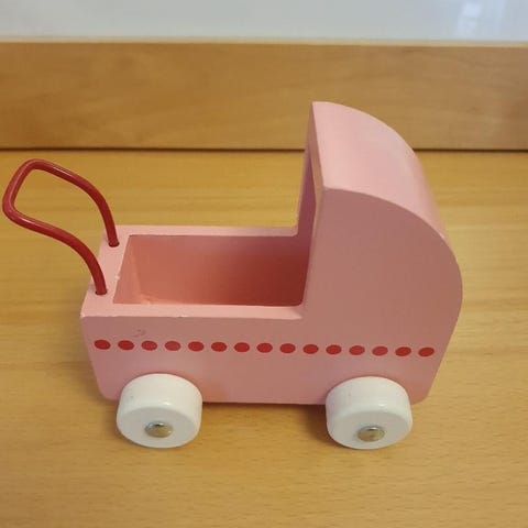 Andet legetøj, Ældre træbarnevogn. Der mangler en hjulkapsel