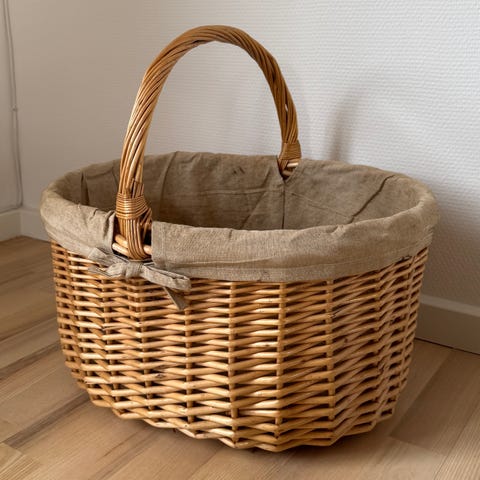 Flet kurv med hank. Har kortvarigt været anvendt til tøj opbevaring. Kun afhentning.