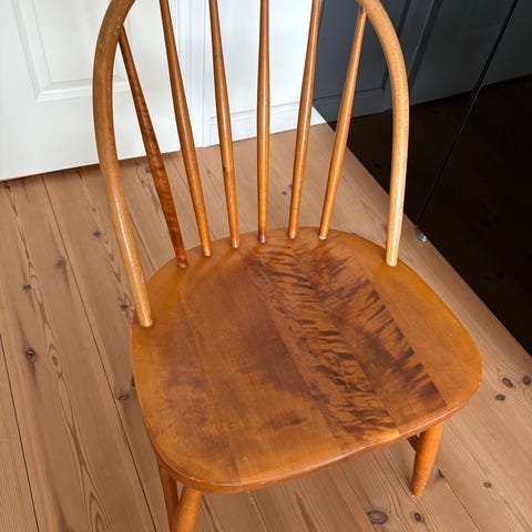 Sælger vores smukke spisebordsstole designet af Børge Mogensen. Det er ikke FDB-stolene, men en langt mere stabil og holdbar model. Modellen minder om den der nu produceres af Hay. Der er dog her tale om en original model J49 designet af Børge Mogensen og produceret af Fredericia Furniture (se stempel og mærke). Modellen er ikke længere i produktion. Stolene fremstår alle med lettere brugsspor (se nærbillede), men er i rigtig god stand. De er faste og inden pinde er løse eller lign. Der er 9 stole i alt som sælges til en samlet pris på 8.000 kr.