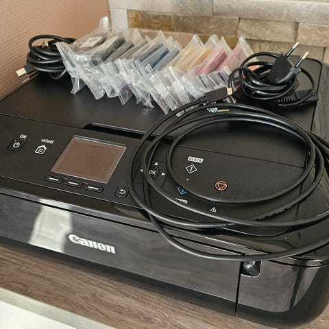 Canon PIXMA MG6250, Canons flagskib i mellem klassen. En ældre sag men kørt meget lidt af privat. 150 stk. papir cassette + Arkfødning - Scanner. Direkte print og kopi sort/hvid og farve på toppen af printeren. Denne printer kan næste alt og der medfølger nye Farvepatroner. NB: Printerdriver for Windows 11 forefindes ikke, men på nettet kan hentes en række "works arrounds" tool. Afhentes i Espergærde - kan sendes med D A O - hvem kommer først