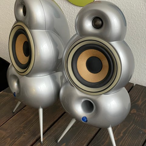 Super fede og kompakte højtalere. De spiller super godt og lyder formidabelt deres størrelse taget i betragtning. Enhederne er lavet i Kevlar. Der medfølger originale vægbeslag (799.-) og aluminium fødder. Det er passive højtalere.