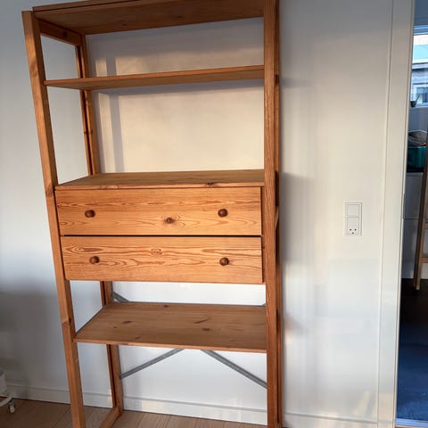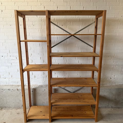 Original ABC-reol - en bred og en smal med skuffesektion. Er “ludet” hvid med maling, kan evt males eller genopfriskes. Kryds bagpå til at stabilisere.
