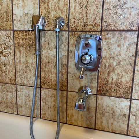 Den har desværre en frost skade i den eneste del, se billedet. Dette kan evt fixes/skiftes eller man kan tilkoble vandet længere oppe og ikke bruge den del som er gået i stykker.