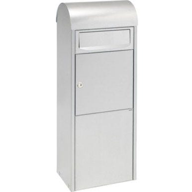 Lille grå postkasse i metal med tilbehør til ophæng.