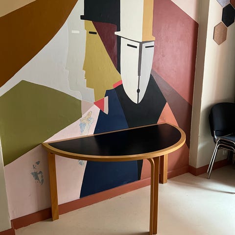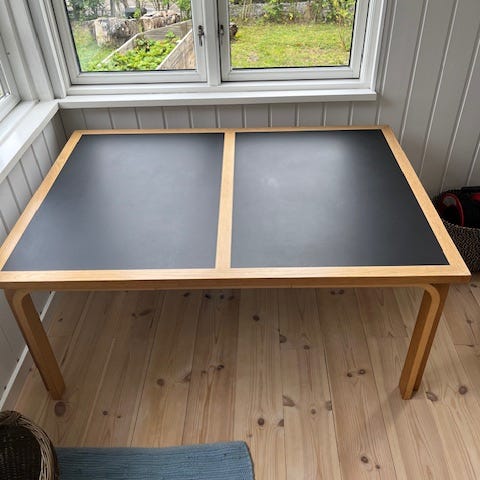 Sofabord med sort linoleum.