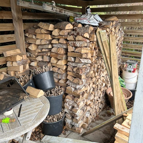1 rummeter tørt brænde. Kløvet. Blandet løvtræ.
