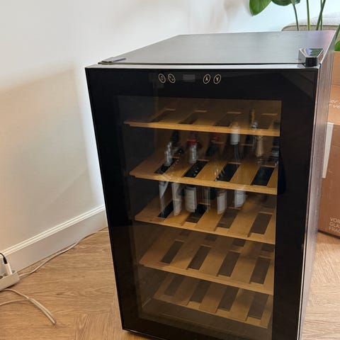 Rigtig fint lille vinkøleskab med plads til ca. 24 flasker. Tonet glas i døren, 2 temperatur zoner.