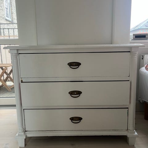 Hvid kommode med 2 små og 3 store skuffer. Måler ca. 88 cm. i højden med ben. Ca. 35 cm. dyb og ca. 90 cm. bred. Almindelige brugsspor, men generelt i fin stand. Den skal hentes og man skal selv bære den ud af et rækkehus.