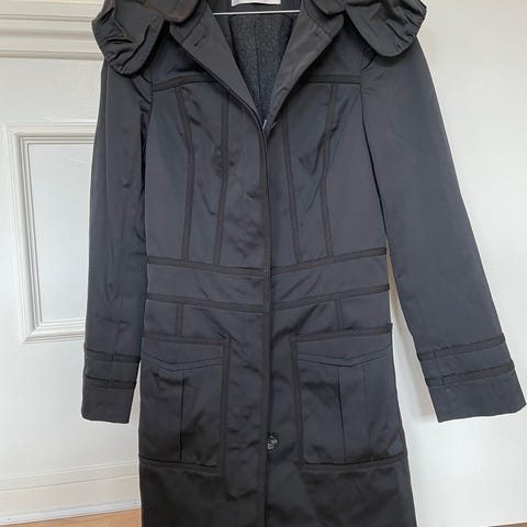 Fin lang klassisk uldfrakke, der lukkes med knapper fortil. Selve frakken fejler intet, men linningen indvendig ved begge ærmer skal sys, se foto. Frakken kan også fint bruges uden at sy linningen.
