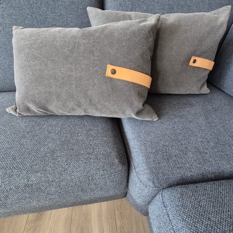 Puderne er i pæn stand og passer godt til sofa eller lænestol i nordisk stil.