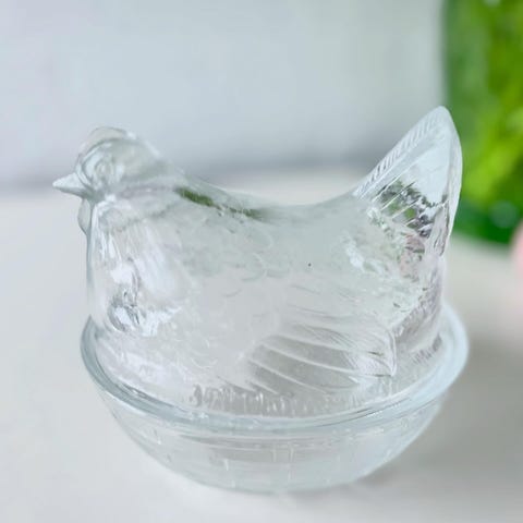 Lille glashøne i klart glas 🐣 Brug den til saltet på påskebordet. Kanten i reden har en lille bule, som gør at hønedelen står lidt skævt i reden. Se billede 5. Ellers flot stand. Længde 9,5 cm. Højde 7 cm.