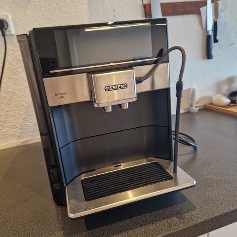 Siemens EQ series espressomaskine i sort. Fuldt automatisk maskine med frontbetjening og display. Maskinen har integreret kaffeudløb og drypbakke. På billederne ses også Siemens EQ series Coffee-Service-Set og vandfiltre, som typisk anvendes til rengøring og vedligeholdelse af denne type maskine. Velegnet til brygning af forskellige kaffedrikke som espresso og kaffe i hjemmet eller på mindre kontorer.
