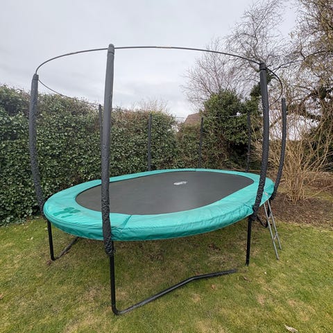 Berg trampolin brugt og trænger til en rengøring. Side net har huller, men kanter, fjeder og dug er helt ok.