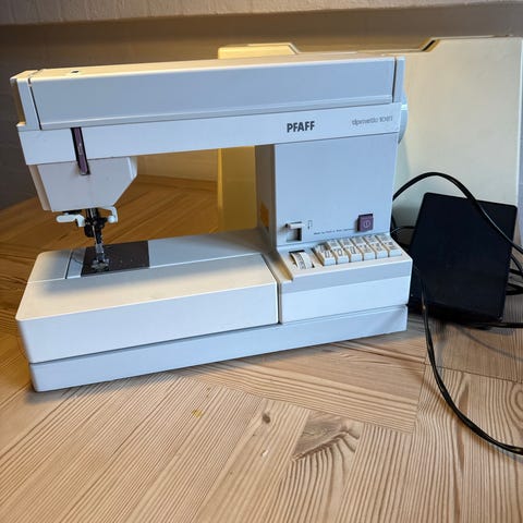 Maskinen virker, syr fint og lyset fungerer. Original Pfaff fodpedal medfølger.