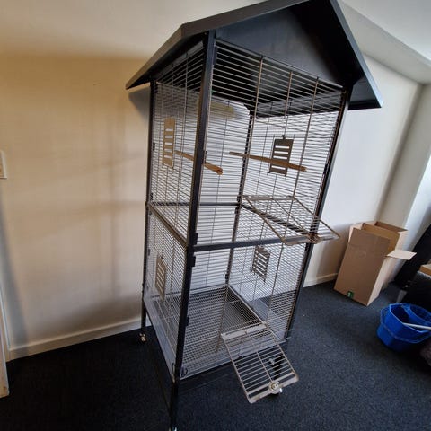 Fuglebur til nymfeparakit med åbning i toppen af buret. Monteret med hjul.