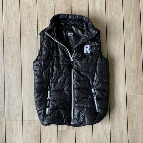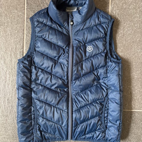 Vest, dynevest, Rebus, str. 92, Petroleumsfarvet ("blå/turkis") dynevest i størrelse 92 fra Rebus. Vesten er ikke brugt meget og er i rigtig pæn stand.