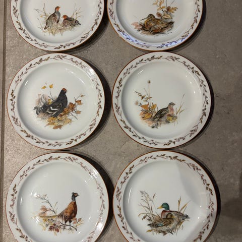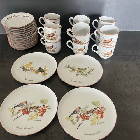 10 kopper, under kopper og kage tallerkner.