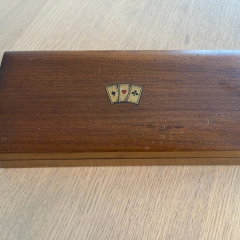 4 små kortæsker i træ med små jetoner i. Sandsynligvis lavet af ben. Æskerne er i pæn stand men bærer præg af slid. De stammer sandsynligvis fra omkring år 1900. Sælges samlet.