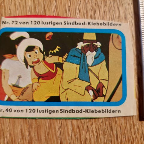 Klistermærke fra 70'erne klippet ud af et ark med Sindbad klistermærker.