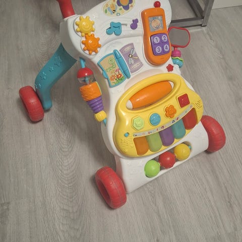 Fisher-Price gåvogn og aktivitetsbord til børn. Gåvognen har et løve-design med håndtag og hjul, som kan støtte barnet under de første skridt. Aktivitetsbordet har forskellige knapper, drejeelementer og forme, der kan bruges til leg og træning af motorik og hånd-øje-koordination. Velegnet til små børn, der er i gang med at lære at stå, gå og udforske simple aktiviteter.