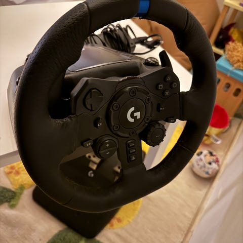 Logitech G920 rat og pedalsæt i sort. Sættet består af et rat med integrerede knapper samt et separat pedalsæt med tre pedaler (kobling, bremse og speeder). Egnet til brug med Xbox og pc. Tilsluttes med kabler, som fremgår af billederne. Velegnet til bilspil og racersimulatorer, hvor der ønskes mere præcis styring med rat og pedaler.
