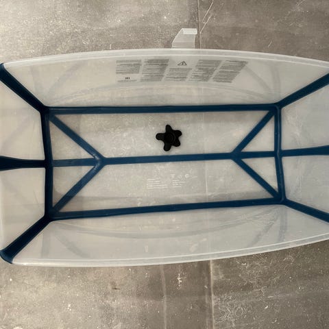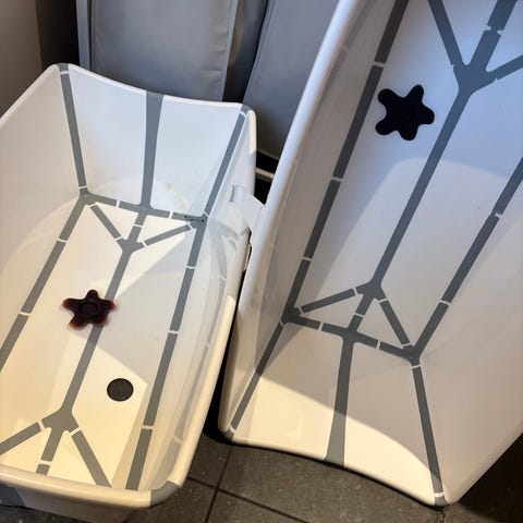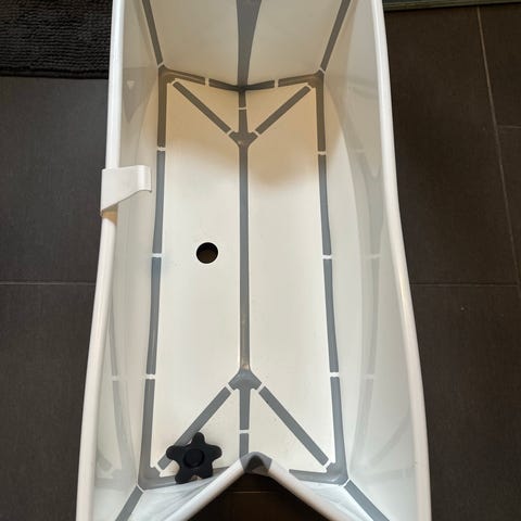 Stokke Flexi Bath babybadekar i hvid med blå støttekanter. Badekarret er sammenklappeligt og kan foldes fladt for nem opbevaring. Det er fremstillet i plast og egner sig til badning af spædbørn og småbørn. Velegnet til brug i bruseniche, badekar eller på badeværelsesgulv efter behov.