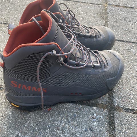 Medfølgende Pool 12 River Runner wading shoe vadestøvler i størrelse 43. Støvlerne er snørestøvler i grå/sort farve, beregnet til brug sammen med waders med sokker. Velegnet til fiskeri og anden aktivitet i vand og vådt terræn.kontakt på 50446310