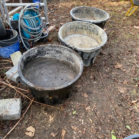 Murerbaljer og spande sælges. Bemærk at de bestemt ikke er til pænt brug. De kan bruges i landbrug, byggeri, renovering, have og lignende. I en af de sorte spande er der boret huller i bunden. Sælges samlet.