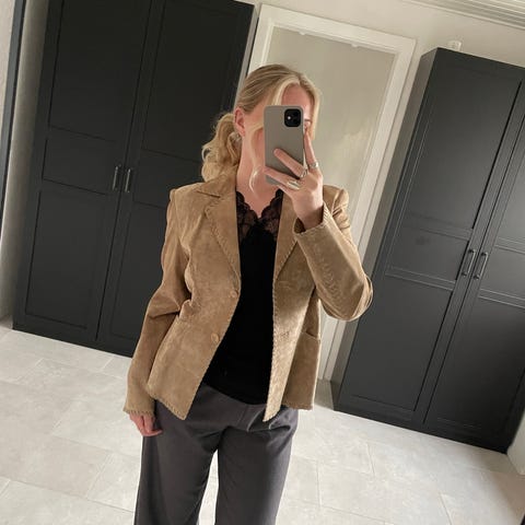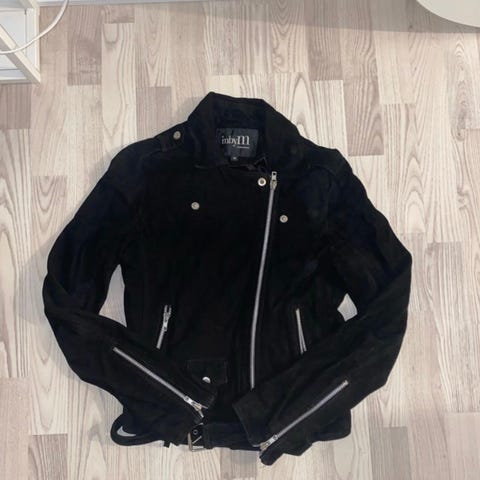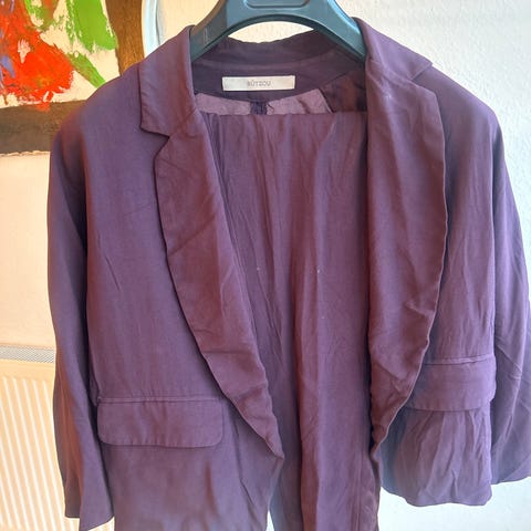 Blødt jakkesæt i ruskind, str. M. Lidt brugt og få brugsspor. Kunne godt bruge en rens.