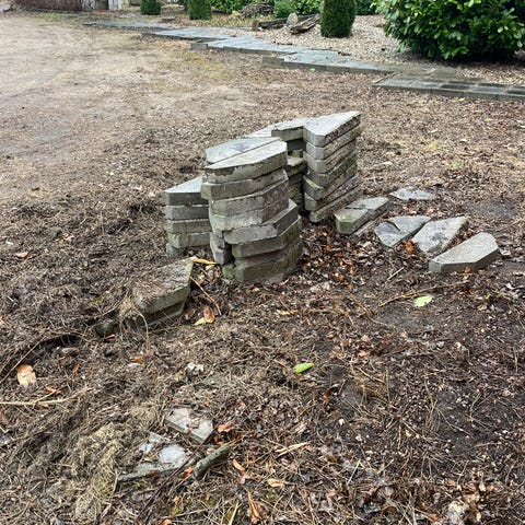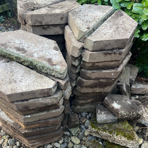 Havefliser, marksten og flagstangsholder kan hentes gratis. Ligger så trailer kan parkeres tæt ved.