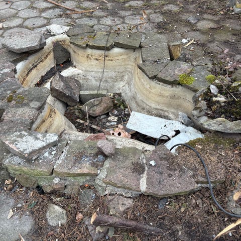 Havefliser, marksten og flagstangsholder.
