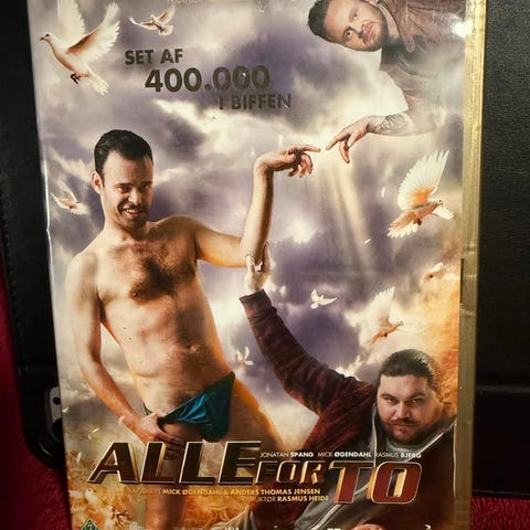 Alle for én dvd film. Dansk komediefilm udgivet på dvd med dansk tale. Coveret viser oplysninger om medvirkende skuespillere samt ekstramateriale, herunder bag om filmen, fraklip og andre bonusfunktioner. Velegnet til afspilning på dvd-afspillere, der understøtter dvd-formatet.