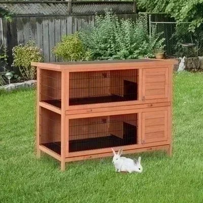 Dobbelt kaninbur hvor kaninen kan gå op og ned af trappen i buret.