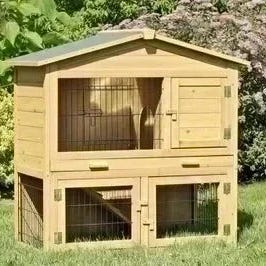 Dobbelt kaninbur hvor kaninen kan gå op og ned af trappen i buret.