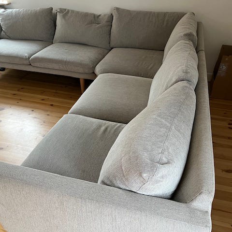 Sofaen befinder sig nær Holbæk. Vi hjælper gerne med at bære den ud til bilen eller traileren efter aftale.