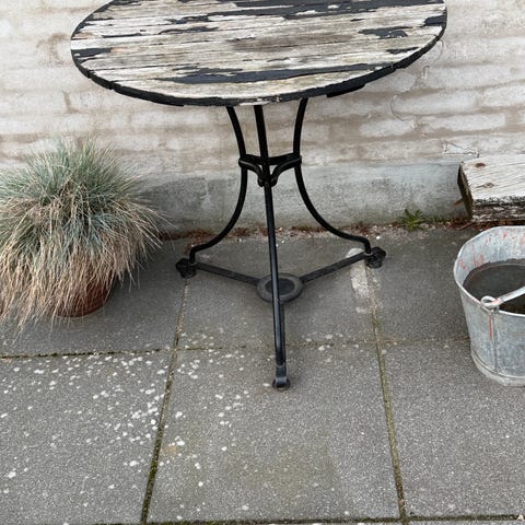 Rundt bord i sort metal. Bordet har en enkel, moderne konstruktion med rund bordplade og metalben. Egnet som lille spisebord, altanbord eller sidebord både inde og ude, afhængigt af behov og placering.