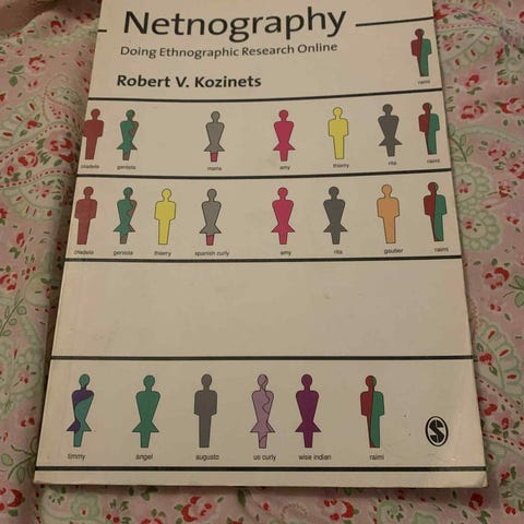 Vejledning i at udføre etnografisk forskning på nettet, også kaldet netnografi. Metoden er designet til at undersøge forbrugeradfærd blandt (sub-) kulturer og communities på internettet og bygger på de traditioner og teknikker, som kulturantropologien anvender. Der gives overblik over nyere forskning med fokus på metoderne og med eksempler på de nye elementer og tilfældigheder, som er vilkårene i studiet af blogging, microblogging, videocasting, podcasting, sociale netværks-sites, virtuelle verdener m.m.