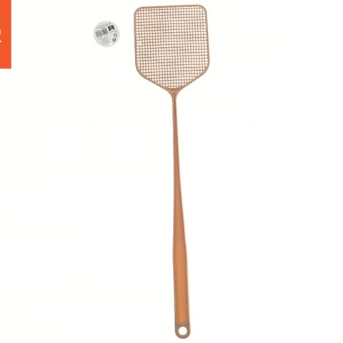 Fluesmækker lavet af plast, designet til effektiv bekæmpelse af insekter. Den måler 50x11 cm og har et langt håndtag for nem betjening. Materialet er robust, og der er en praktisk ophængningsløkke i enden af håndtaget.