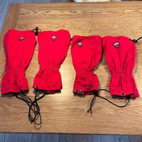 Et par sorte gaiters med elastisk kant og justerbar rem. De er designet til at beskytte ben og fødder mod vand og snavs under vandring eller andre udendørs aktiviteter. Størrelsen er 50 cm.