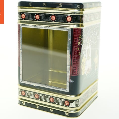Metaldåse med guldfarve indvendigt og et detaljeret orientalsk mønster i sort, rød og guld på ydersiden. Motivet inkluderer fugle og botaniske elementer samt scener fra det asiatiske liv. Der er nogle brugsspor og en mindre ridse på låget.