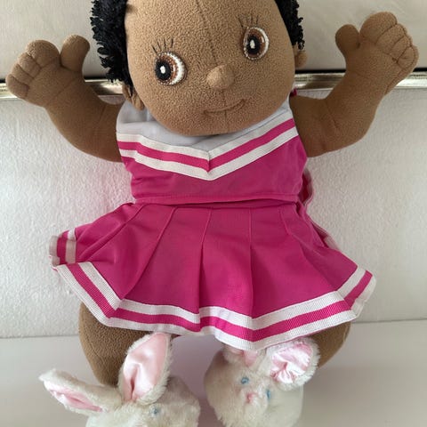 Dette er en blød dukke på 40 cm iført en rød og hvid stribet kjole og en lille gul taske. Dukken har sort strithår og er designet til at være krammevenlig. Den har små detaljer som runde øjne med fylde, og de kan bruges som en god ven til børn at lege med eller som en dekorativ genstand.