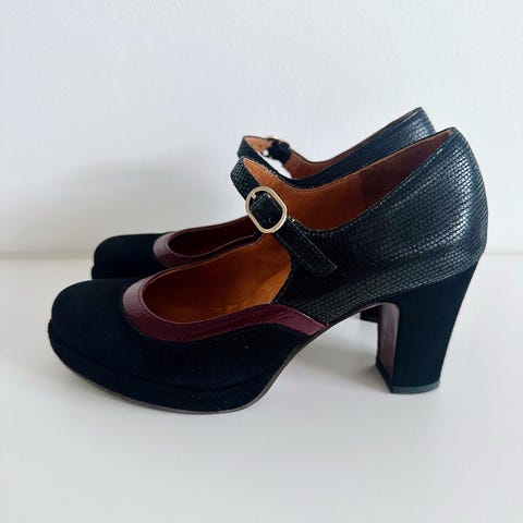 Et par sorte ruskindspumps af mærket Chie Mihara med lav kilehæl og dekorativ knude foran. Skoene har let slid på sålerne og normal slitage i indersålen. Str. 41
