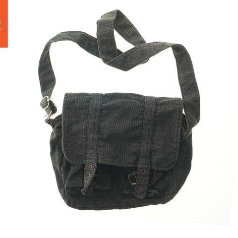 En sort lærredsskuldertaske med to ydre lukningsstropper på fronten og en justerbar skulderrem. Tasken har en flaplukning og flere rum til opbevaring. Størrelsen på tasken er 33x24 cm.