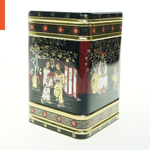 Metaldåsen er dekoreret med asiatisk inspirerede motiver, heriblandt fugle og blomstrende grene samt scener med figurer iført traditionelle dragter. Boksen ser ud til at være formet som en rektangulær te-dåse med aftageligt låg.