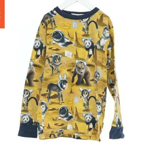 Langærmet bluse fra Molo med et farverigt karrusel design, der inkluderer forskellige dyr som heste, svaner og tigre. Blusen er i størrelse 116.