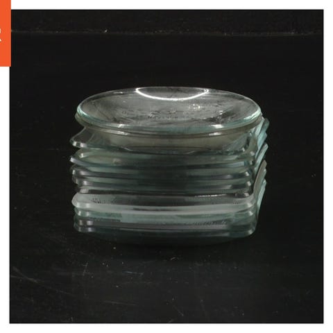 Rundt askebæger i blåt glas med koncentriske cirkler og indhak til cigaretter. Genstanden har en vis tyngde og er fremstillet af solidt, gennemsigtigt glas med en dyb blå farve.