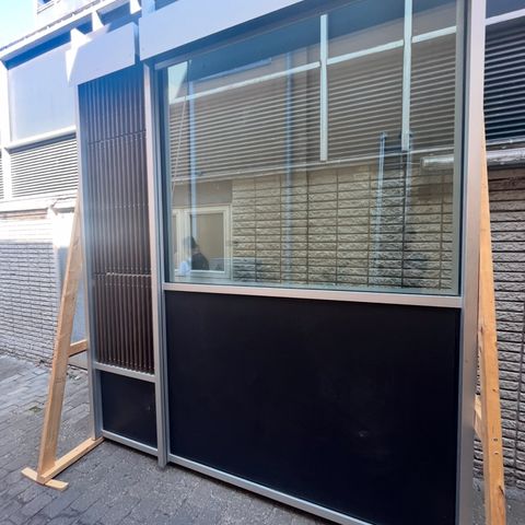 Træ/alu Facadeparti i hvid/hvid, med oplukkelige rammer uden glas, men med isolerede fyldninger i stedet.