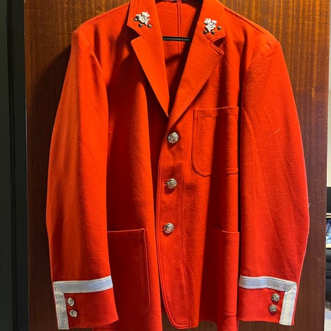 Frakken er udført i kraftig rød uld og har dobbeltradet lukning med originale knapper. På kraven sidder metalemblemer med posthorn og krone samt rangtegn.