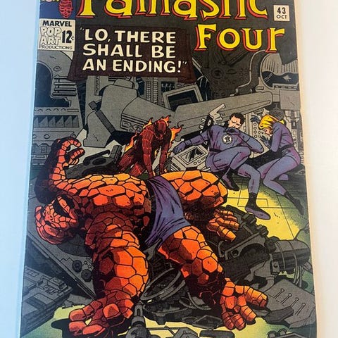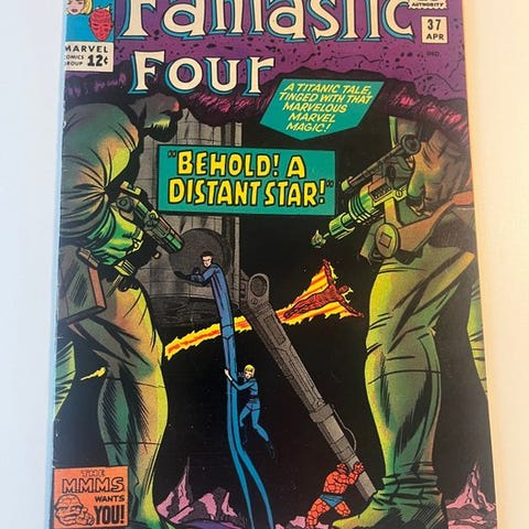 Pin up Still Present, en førsteudgave af Fantastic Four-tegneserien nr. 34 (første optræden af Greg Gideon), udgivet af Marvel Comics i 1964, med kunst af Jack Kirby, Chic Stone og Stan Lee, hæftet binding, i very fine stand som enkelt emne. Klik på den blå "gå til varen" knap, for at købe eller byde på denne vare. Den samlede pris vil blive vist inden du afgiver dit bud.